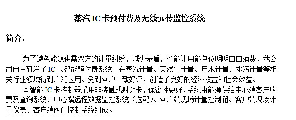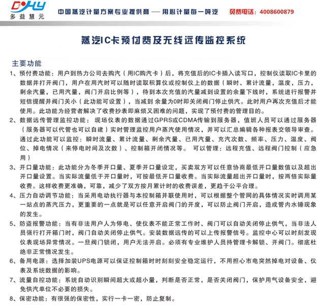 13、提示報警功能:汽、水量小于設定值控制箱會自動發(fā)出報警,提示用戶及時充值。